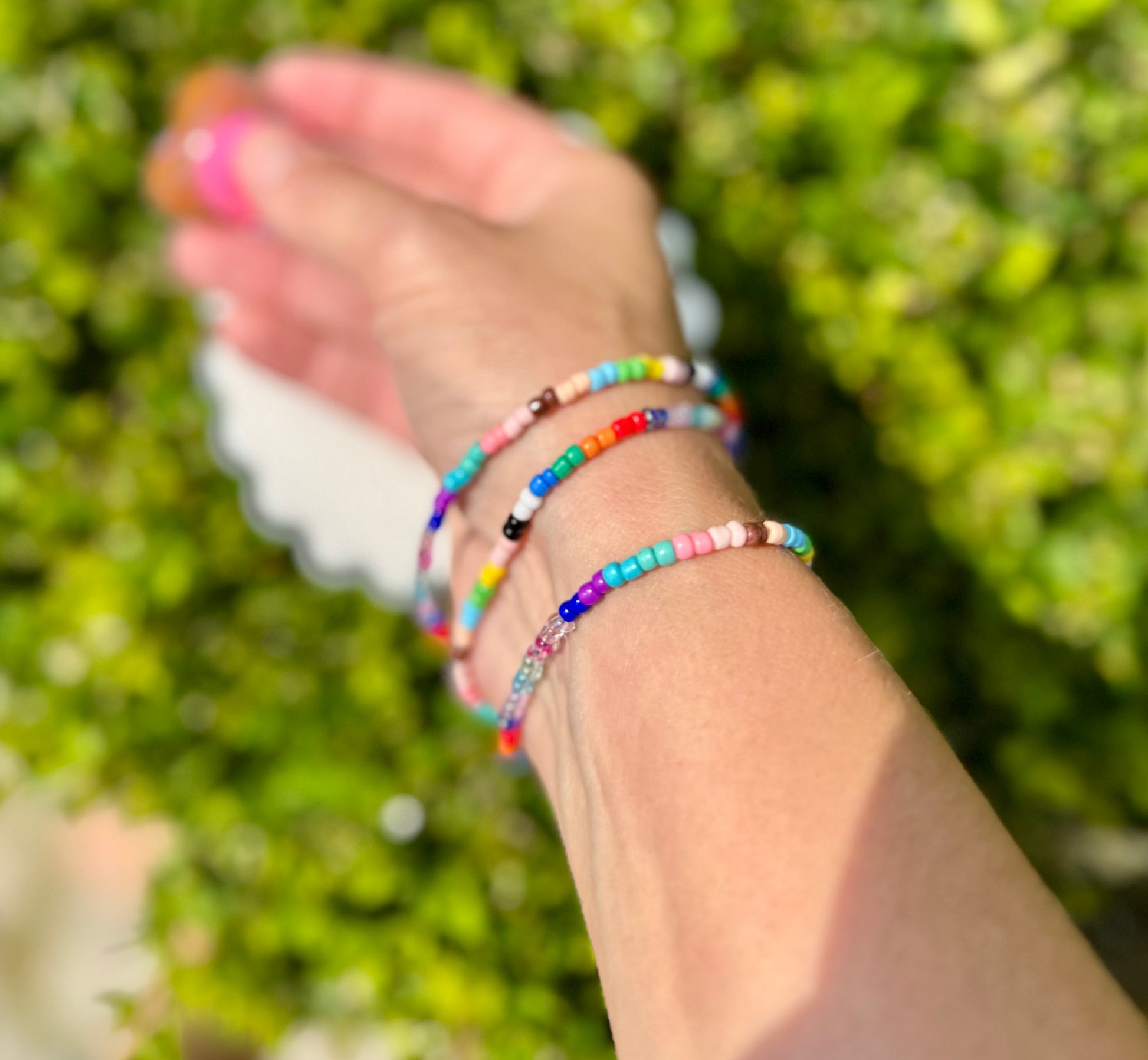 Beaded necklace in rainbow colors that can also be used as a layered bracelet.